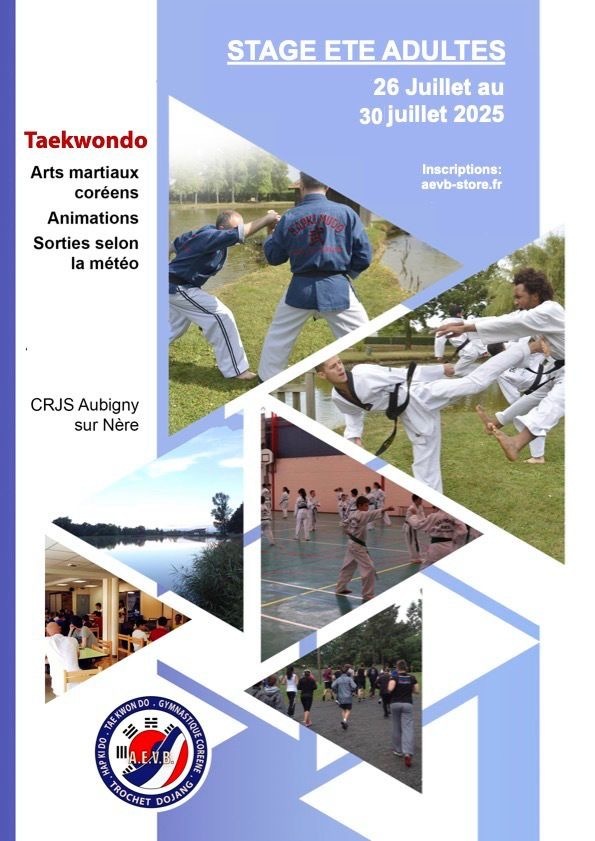 Cours de Taekwondo technique et combat, passage de grade en fin de stage. Initiation aux armes (bâton, couteau, nunchaku). Piscine, jeux de plein air. Fête de fin de stage et séances de cinéma dans la semaine (si possibilité).